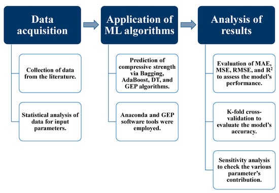 Supervised machine learning (SML) methods are widely employed in the fields of artificial intelligence and computer science and have an irrefutable impact on engineering. They have quickly achieved popularity in civil engineering, particularly for the prediction of the mechanical strength of materials. SML techniques can be used for prediction results with great accuracy. Ahmad et al. [] used individual and ensemble machine learning (ML) approaches to foretell the compressive strength (CS) of FA-based concrete. Su et al. [] compared the accuracy of predictions made using a multi-linear regressor, support vector machine, and artificial neural network to predict the bond strength between fiber-reinforced polymers (FRPs) and concrete. Nguyen et al. [] forecasted the CS of eco-friendly FA-based geopolymer concrete utilizing ML algorithms. Ahmad et al. [] predicted the chloride penetration in concrete containing waste material using a decision tree, artificial neural network, and gene expression programming techniques. Gene expression programming was demonstrated to be a more effective prediction technique than other algorithms. However, further exploration is required in this area to better understand and apply these approaches in civil engineering while utilizing different datasets and SML techniques.