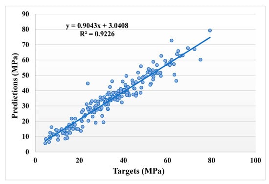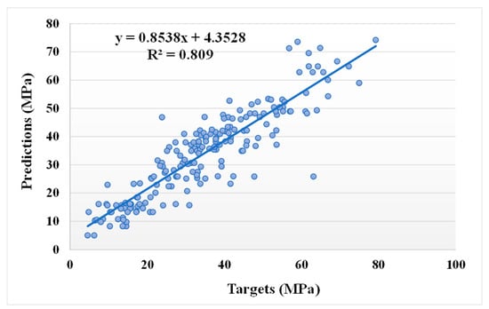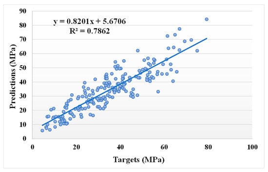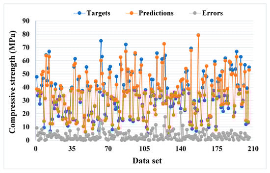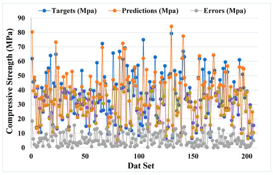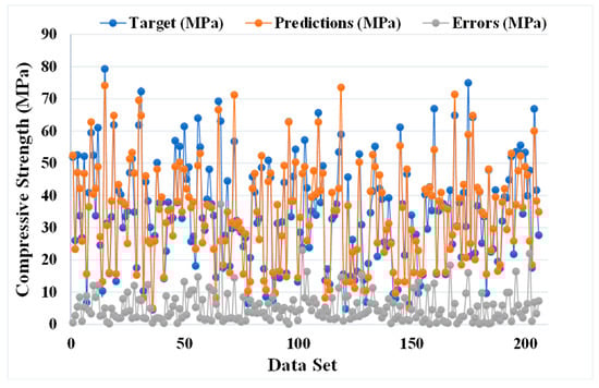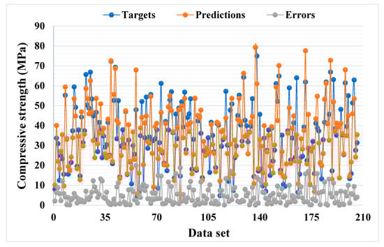 Figure 7 and Figure 8 show the comparison between the actual and anticipated outcomes for the GEP model. The correlation between the targeted and projected outcome is shown in Figure 7, indicating the value of R2 equals 0.81, which is also within an acceptable range with less variation. The distribution of actual values (targets), predicted values, and errors for the GEP model can be seen in Figure 8. The error distribution’s highest, lowest, and average values were 37.30, 0.11, and 5.24 MPa, respectively. We noted that 11.16% of the error values were between 0 and 1 MPa, 48.54% of the error values were between 1 and 5 MPa, 27.67% of the error values were between 5 and 10 MPa, and only 12.62% of the error values were above 10 MPa. In comparison to the bagging and AdaBoost models, the GEP model’s accuracy is less in terms of predicting the CS of SCM-based concrete, as indicated by the R2 value.