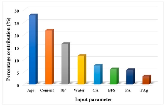This investigation is concerned with the influence of input parameters on forecasting the CS of SCM-based concrete. The input parameters have a considerable impact on the outcome projection []. The influence of each input parameter on the CS prediction of concrete is depicted in Figure 11. We noted that age contributed the most (27.8%), while cement and superplasticizer contributed 21.7% and 16.3%, respectively. However, the other variables contributed less, with water contributing 11.5%, coarse aggregate 7.6%, BFS 6.1%, FA 5.8%, and fine aggregate 2.1% to the prediction of CS of SCM-based concrete. The sensitivity analyses produced results proportional to the number of input parameters and data points utilized to run the model. However, the applied ML method identified the influence of each parameter, and this analysis produced varying results due to the variation in concrete mix proportions and the addition of other input parameters. The following Equations (4) and (5) were used to determine each variable’s contribution to the model’s output: