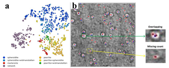 At the nanoscale, transmission electron microscopy (TEM), SEM, and EBSD can be used to prepare image libraries for training ML frameworks. An important application of ML trained on SEM images is the steel microstructure classification. In Refs. [11,12], CNNs were applied to classify microconstituents of ultrahigh carbon steels (UHCS). This is a characteristic application that can be extended in a large collection of material classes [45]. Figure 3a presents the t-distributed stochastic neighborhood embedding (t-SNE) map for the UHCS data set and the constituents were classified based on SEM images. In Refs. [65,66] the fully convolutional neural network (FCNN) accompanied by a max-voting scheme was applied to classify microconstituents of steel. For this goal, fine-tuning and data augmentation were applied. The ML framework was trained on both SEM and light OM images. Beyond neural networks [67], the classification of steel microstructures can be performed by the application of support vector machines (SVM), or RF assisted with gradient boosting machines.