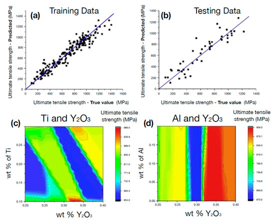 Bulk elasticity of metals, as a main functional property, is largely controlled by electronic structures, chemical bonding, atomic/molecular arrangements, preparation history, and thermal treatments, forming an intractable design space from a materials engineering point of view. The materials science literature provides numerous instances where an appropriate combination of surrogate data-driven models and deformation-based experiments led to robust and meaningful predictions of key functional properties out of a tremendous feature space (for example, see Figure 4 for a characteristic application for the prediction of ductile, high-strength alloys [89]). Earlier attempts in this context originated in the use of data analytics (neural networks in particular) in flow stress prediction of metallic materials [90], aluminum alloys [91,92], steel [93,94], Ti alloy [95] under varying temperature, deformation rates, and applied strains. Neural network training was also practiced in terms of the alloy composition search that, along with heat treatment parameters, lead to accurate evaluations of yield strength, hardness, ductility, elasticity, fatigue properties, and fracture toughness [96,97,98,99,100,101,102]. Furthermore, in [15], an extensive neutron-diffraction characterization was carried out to obtain elastic constants associated with an Al CoCrFeNi alloy under uniaxial tension. The empirical measurements along with an appropriate set of relevant elemental parameters (i.e., group number, cohesive energy, density, atomic radii) were used to feed a gradient-boosted trees algorithm. More generally, intensive research effort was undertaken in the field of amorphous metals. For example in Ref. [37], a set of dynamically-measured elastic moduli based on ultrasonic-wave-propagation tests led to an SVM regressor that was used to relate bulk and shear moduli to a set of training features, with the atomic electronegativity, atomic volume, and atomic size differences being selected as best-performance descriptors.
