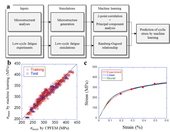 In this context, an interesting materials informatics application was presented in [130,131]. The approach is based on coupling experimental techniques, crystal plasticity (CP) simulations and Bayesian networks to investigate the short crack growth in beta-metastable BCC titanium alloy (VST-55531) subjected to high cycle fatigue. The applied experimental technique was a combination of diffraction contrast tomography, multiple phase-contrast tomography scans, and modern reconstruction and segmentation techniques. Tree augmented Naive Bayes methods were applied to extract correlations between postulated short crack driving force metrics and experimental results. Another interesting application is the investigation of the cyclic stress-strain curves of various dual-phase steels differing in pearlite-to-ferrite proportion as predicted by Miyazawa et al. [114] (see also Figure 5). First, the microstructural analyses were conducted using EBSD in order to extract the grain morphology and determine the location of both phases. Then, the stress-strain curves obtained from low-cycle fatigue experiments were utilized to obtain the parameters of the macroscopic J2 plasticity model of pearlite phase and crystal plasticity model of ferrite. Then, 2D FEM simulations were conducted in order to provide the dataset for ML. Two ML frameworks, namely the linear regression and neural network, were applied to dimensionally reduced datasets thus enabling to provide cyclic stress-strain predictions.