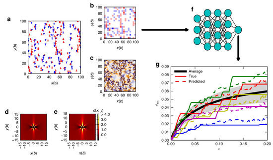 Despite the wide range of successful applications achieved by DDD in the field of mechanical properties of materials, the advent of MI sets a new paradigm on how traditional DDD frameworks can be utilized towards insightful predictions for structure-property relationships [162,163,164,165,166]. The ability of ML models such as ANN to learn complex non-linear behaviors provides an opportunity to guide the understanding of complex collective dislocation behaviors and their influence on mechanical deformation. In this way, DDD can be regarded as a high-throughput approach to generate large data, to be analyzed by ML approaches in the search of new physical correlations, generally hidden by the ensemble and relevant mechanisms’ complexity. In this context, Ref. [167] demonstrated that it is possible in simple models to predict stress/strain curves as simulated by two-dimensional DDD simulations starting from features extracted from initially random dislocation microstructures. The importance of the result is encapsulated in the complexity of the initially random configurations, which may also acquire fractal characters [82,168,169]. The descriptors exploited in this work were features extracted from the initial dislocation microstructures (Figure 8a) such as the density of GNDs and the internal stresses as shown in Figure 8b,c, respectively. The authors addressed the issue of deformation predictability starting from systems with different sizes and also considering the effect of pre-straining the system before training (Figure 8d,e). Results regarding the performances of their NN-based model (Figure 8f) on the prediction of the stress-strain curves showed that better performances can be obtained for larger systems and higher deformation strain. Likewise, initial pre-deformation improves the predictive ability of the model. Similar topological descriptors were employed [170] to characterize precipitates-mediated jamming-to-pinning transition in terms of the dislocation network topology. Using dislocation structures as input, a confusion algorithm was successfully trained based on the binary classification of states according to the probability of being a member of the pinned or jammed phases. In more physically consistent conditions, Ref. [171] discussed high-throughput DDD simulations [58] towards generating synthetic experiments for 2D thin aluminum films, where the pre-processing route, in the context of the level of tensile pre-straining, controlled the initial dislocation configuration. Then, prediction of stress-strain curves and mechanical properties was achieved by repeating synthetic DIC experiments, and by using both unsupervised and deep-learning ANNs. The comparison between deep-learning and unsupervised learning methods showed a drastic advantage towards deep ANN approaches. In this way, progress in DIC techniques may provide a tool for a complete, non-destructive characterization of the mechanical behavior of materials.
