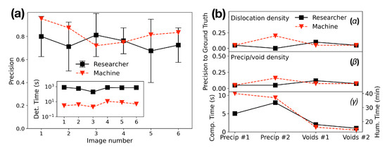 Modern advances in software and the development of fast computer processors potentially increase real-time image recognition, by coupling them with the electron microscopic system to make possible a direct, on-the-fly in situ analysis. Here, efforts have been made to apply CNN architecture to analyze and identify common crystallographic defects in structural alloys like dislocation lines, precipitates and voids [185]. In Figure 9b it is seen that machine vs. human performance, through computing materials’ evaluation metrics for defect quantification, can be comparable for several categories of defect quantification, such as dislocation density, precipitate density, diameter, and diameter standard deviation of precipitates and voids. Overall, automated identification of common crystallographic defects in metals using deep learning semantic segmentation, based on high-quality microscopy data, may provide more accurate results than conventional manual counting, and thus advance model performance.
