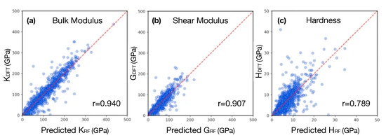 ML and Hardness in multi-component alloys. The Pearson correlation coefficient (r) is utilized as a metric for (a) bulk modulus (K), (b) shear modulus (G), and (c) hardness (H) for 10,421 alloy samples acquired from the Materials Project database [32]. The machine learning models are trained to predict, K, and G, based on density functional theory (DFT) calculations. (Reproduced from [43], based on Creative Commons Attribution 4.0 license.)