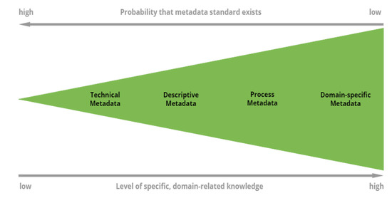 Metadata categories with the specificity level. With an increasing level of specificity, the probability of existing metadata standard is decreasing (Redrawn, based on [238]).
