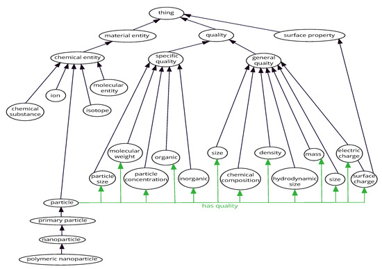 A convenient way of organizing metadata is by incorporating an ontology, which serves as a framework for metadata design [259]. For mechanical deformation MI applications, such ontologies are currently being pursued. Ontologies and ontology-based techniques are aimed at providing a shared standardized representation of terminology over a domain. In particular, by imposing an ontology-based description of the data, the level of interoperability and reusability is increased, while introducing metadata derived from ontology allows for promoting findability and accessibility. Ontologies are defined as sophisticated classification schemes aimed at making complex data searchable. They have a hierarchical structure and define the basic terms and relations over a domain, as well as the rules for combining them [259]. Ontologies consist of four components: (i) concepts that represent sets or classes of entities in a domain, (ii) instances that represent the actual entities, (iii) relations (is-a or has-a), and (iv) axioms representing restrictions imposed on the domain. The tree-like ontology structure allows organizing entities based on their granularity, from general to specific. The actual set of components might be the basis for ontology classification; for example, in Figure 14 a little sample of NanoParticle ontology [260] is presented, where the black arrows represent axioms of is-a relations, i.e., if A is B, then all entities belonging to A belong to B as well. A is referred to as a sub-concept of B. In this example, a chemical substance, particle, ion, isotope, and molecular entity are all sub-concepts of a chemical entity. Therefore, all chemical substances, particles, ions, isotopes, and molecular entities are also chemical entities. Furthermore, all primary particles are particles, all nanoparticles are primary particles, and so on. It is clear that the is-a relation is transitive i.e., describes inheritance of properties. Another important relationship is the has-a relation, which is associated with the axiom that entities have qualities (green arrows).