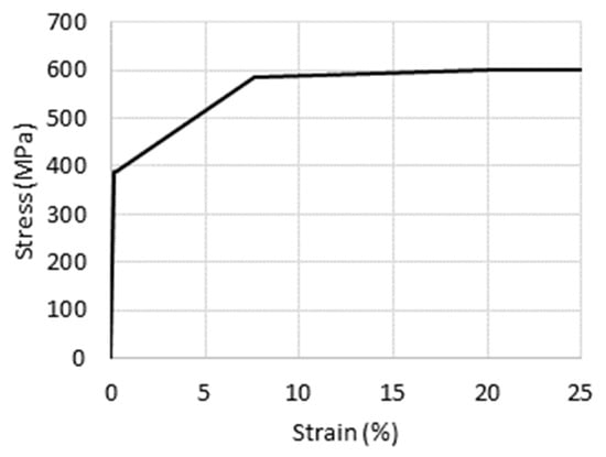 The simulations of the three-point bending test were carried out in Abaqus 6.12 [37]. The connection between box-section beams and extension elements was made by using the “tie” constraint [37]. The quad-linear hardening material model [38] is based on the maximum shear strain energy (von Mises or Huber) yield criterion. The stress–strain curve of the applied material model is shown in Figure 6. The Young’s modulus and Poisson’s ratio of the box section and extension elements were set to 210 GPa and 0.3, respectively [39].
