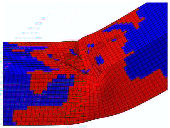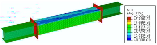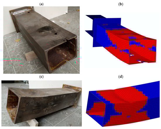 The numerical simulations also effectively reproduced the respective failure modes. The G5 sample, with the thinnest web, showed the form of failure characteristics for a slender cross section (four class by [39]) and a clear buckling wave (Figure 12a,b). The G3 guide sample of insignificant corrosion loss showed the form of failure characteristics for the compact (one or two class by [39]) cross sections (Figure 12c,d). The length of the developing plastic hinges reached about 30 cm.