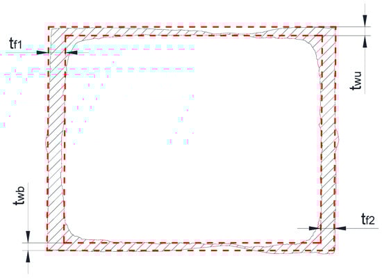 The cross-sectional depth and width are assumed to be nominal. The shape of the simplified section geometry with a uniform wall thickness is shown in Figure 8. The measurement results are presented in Table 2. The elastic (Wel) and plastic (Wpl) section moduli were also calculated.