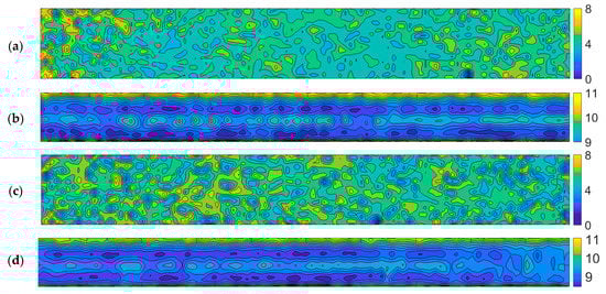 In order to reproduce the corrosion pattern, thickness measurements were performed in a dense, regular mesh of points. The specimens were cleared of rust by electric wire brushes and marked with a 1 cm × 1 cm mesh (Figure 1c). The thickness measurements were performed with a PosiTector ultrasonic thickness gauge (DeFelsko, Ogdensburg, NY, USA), and they were used to produce maps of the web and flange thickness distributions. Sample maps are presented in Figure 9.
