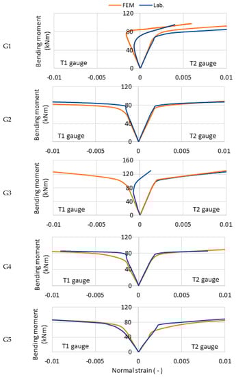 Moment–strain relationship diagram obtained from the laboratory tests and numerical simulations of five naturally corroded beams (G1–G5). The strain readings at the top wall (under compression, T1) are shown on the left, whereas the strain reading at the bottom wall (under tension, T2) are shown on the right.