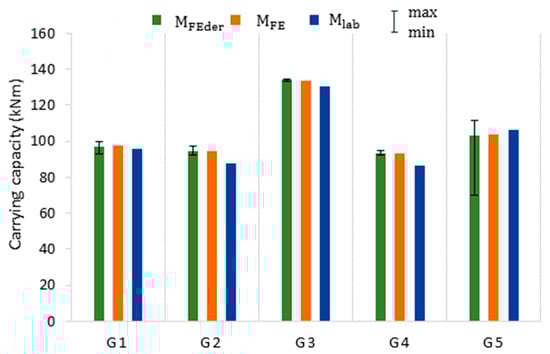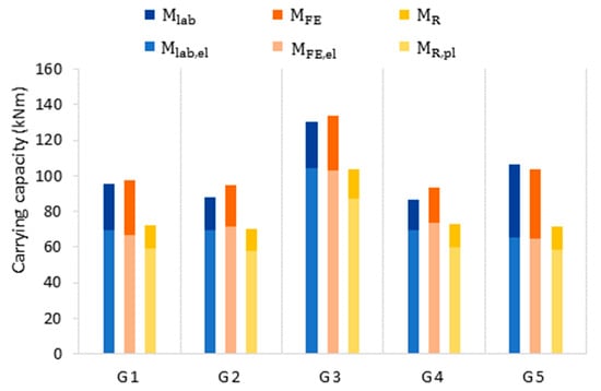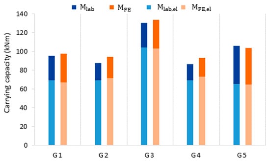 Table 5 presents the results of analytical calculations. Analytical calculation results were compared with the corresponding results of laboratory tests (Mlab,el and Mlab), as shown in Figure 19.