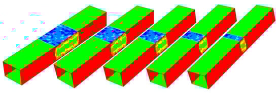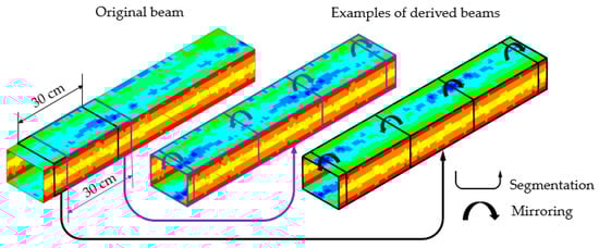 Multiple numerical simulations were conducted on the models based on 30 cm segments of an original beam and forming the central part of a newly derived beam. The remaining parts of the derived beam were completed by mirroring the central part towards both ends of the beam to provide smooth transitions along the beam length and to prevent unnatural edges. Figure 15 shows a few beams created by segmentation and mirroring. The color (from blue to red) indicates element thickness.