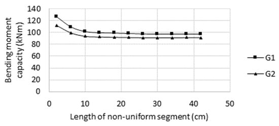 The effect of the naturally corroded segment length on the ultimate moment capacity is shown in Figure 14. For segment lengths greater than 10 cm, the decrease in load-carrying capacity along with the segment length is small. For segment lengths greater than 30 cm, no decrease is observed, which indicates that the 30 cm central part is long enough for determining the moment capacity of the beam accurately and to avoid result bias due to the limited length. This observation is employed later for the investigations presented in Section 3.