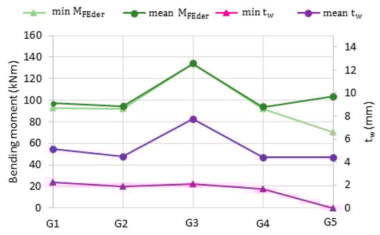 Table 4 describes the results of bending simulations on 140 models (28 for each beam) created by sectioning and mirroring the original beams (G1–G5). The statistics of the load-carrying capacity (MFEder) and web thickness (tw) were presented. The results are also shown in Figure 16 and Figure 17.