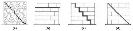 Different shear mechanisms in masonry walls: (a) diagonal shear failure (DS) in irregular masonry; (b) horizontal sliding shear failure (HSS) in regular masonry; (c) diagonal sliding shear failure (DSS) in regular masonry; (d) tensile diagonal cracking in the units (TDC) in regular masonry. Reprinted from Ref. [11].