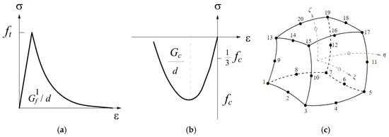 For the FEM, the fracture energies in compression and tension Gc and Gt are evaluated according to Equations (8) and (9), respectively, and are Gc = 10 N/mm and Gt = 0.012 N/mm, based on the values of fc and ft. The Poisson’s ratio is assumed ν = 0.2. An optimization process of the mesh has been carried out and the best mesh size, in terms of reliability of result, and computational effort is identified in 50 mm × 50 mm, whose diagonal d is used in Equations (10) and (11).