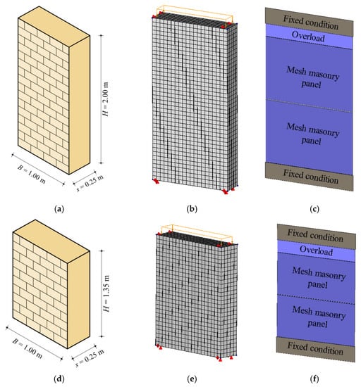 Before carrying out parametric analyses, the reliability of both numerical models has been checked by means of comparisons with the experimental tests of Anthoine et al. [22], assumed as a benchmark. The experimental tests were executed on two masonry walls made of clay bricks according to a ‘regular’ texture, characterized by two slenderness ratios λ = H/B = 2 and 1.35 (Figure 4a,d), with heights H = 2000 mm and H = 1350 mm, respectively, base B = 1000 mm, and thickness s = 250 mm. The computational models corresponding to the two walls are illustrated in Figure 4b,e for FEM and in Figure 4c,d, for DMEM. In our experimental set-up, the tested masonry walls were restrained according to the double-fixed boundary condition.