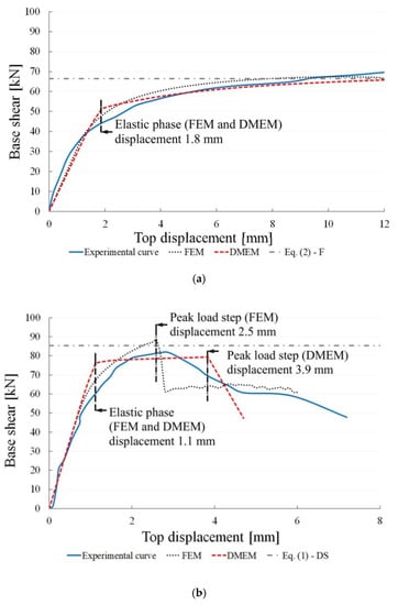 Finally, it can be noted that the two numerical models give similar results, with differences ΔVnum that vary from −15% to +11%. Only for the case 2.6 is there a relevant discrepancy of the results (+33% of DMEM vs. FEM), probably due to an anomalous peak in the DMEM capacity curve for a displacement of about 3 mm.