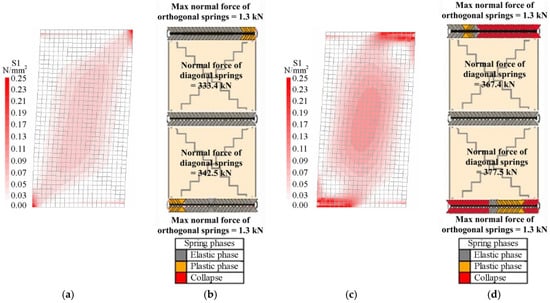 Bearing in mind that the activation of the flexural failure for the DMEM is controlled by the orthogonal springs along the interface elements, Figure 6b,d and Figure 7b,d show the normal forces acting in the springs at the constrained sections of the slender and squat masonry panel, in the elastic field and at the peak load step, respectively. As expected, since the slender wall (Figure 6b,d) failed in flexure, most of these springs are collapsed (red colour) at the peak load step, while at the end of the elastic field almost all of them are still in the elastic phase (grey colour). Moreover, it can be noted that the diagonal springs remain in the elastic phase. Conversely, for the squat masonry, Figure 7b with Figure 7d evidence a clear increasing of the normal forces in the two diagonal springs in comparison with the slender wall (about +50%), because of the shear failure.
