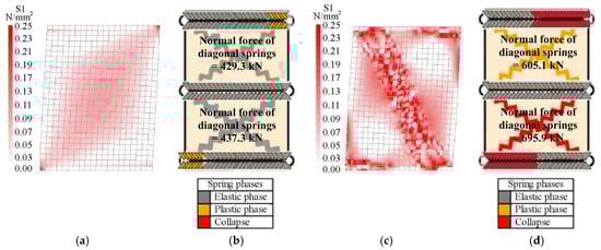 Distributions of the principal stresses and normal forces into the squat masonry panel at the end of the elastic field: (a) FEM, (b) DMEM, and at the peak load step: (c) FEM, (d) DMEM.