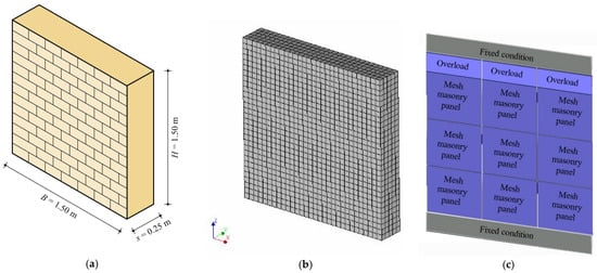 (a) Geometry of the masonry panel used for the parametric analyses and computational models: (b) FEM and (c) DMEM.