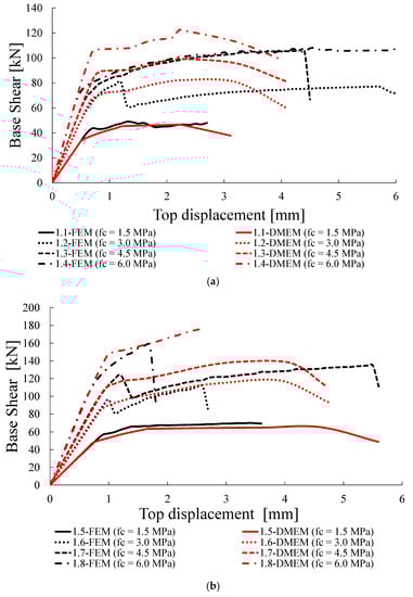 Figure 11a,b show the capacity curves provided by the two software for the case σ0 = 0.3 MPa and 0.6 MPa, respectively. In addition to the good agreement, in terms of capacity, commented upon above, there is a very good correspondence along the elastic branches in terms of stiffness, while some differences occur when the non-linear behaviour is attained, especially for the higher compressive strengths. For the cases with fc = 6.0 MPa (1.4 and 1.8), there is, indeed, the maximum difference in terms of resistance provided by the two models (ΔVnum= 13.4% and 8.3%, respectively).