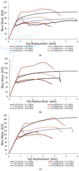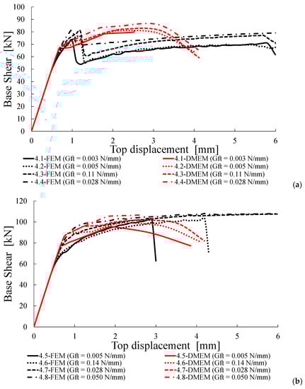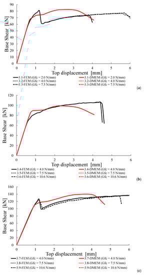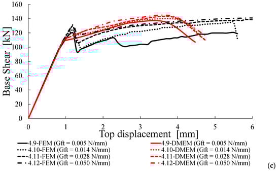 Figure 14 shows the capacity curves provided by the two software for the case σ0 = 0.3 MPa (Figure 14a,b) and 0.6 MPa (Figure 14c). Once again, there is a perfect correspondence between the two approaches in terms of stiffness in the elastic branches. It is worth noting (especially in Figure 14b) that, when the fracture energy in tension increases, the capacity curves of the FEM are able to attain higher ultimate displacements. Conversely, a lower influence of Gt on the ultimate displacement is observed for the DMEM. More in general, Figure 14 highlights that, for most cases, the FEM evaluates a larger ductility in comparison with the DMEM.