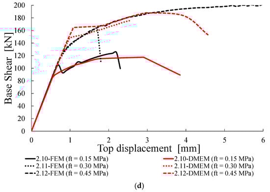 The effects of the variation of the tensile strength ft on the in-plane resistance and the non-linear behaviour of the wall are reported in Table 8. Firstly, it can be noted that the failure modes predicted by the FEM and DMEM are always the same and, in most cases, also coincide with the theoretical ones. The only exception is the case 2.5, for which the theoretical flexural strength, given by Equation (2), is lower than the shear one, given by Equation (1), contrarily to what predicted by the numerical models.