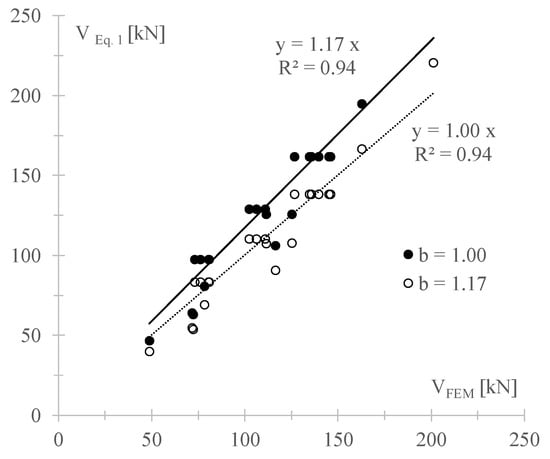 To better investigate the effect of this factor on the in-plane wall response, the numerical shear capacities provided by the FEM are compared, in Figure 15, with the predictions given by Equation (1) for two values of b: (1) b = 1 as herein assumed, and (2) the value of b that best fits the numerical results, i.e., b = 1.17, which allows the arranging of the analytical and numerical results along the bisector.