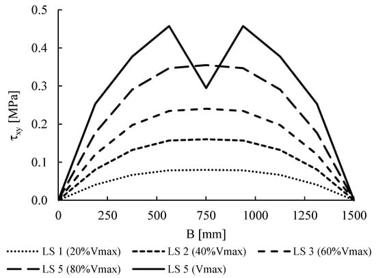 Shear stress distribution along the middle cross-section of the wall for the case 1.6 at different load steps (LS).