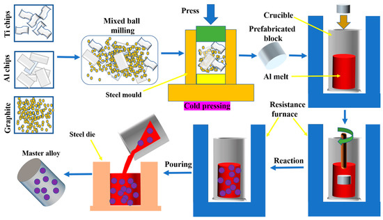 21]. However, poor wettability between graphite and liquid aluminum makes the preparation of A1-Ti-C master alloys difficult and prevents its application in industry. The current hotspot for Al-Ti-C is to solve the problem of wettability and develop an economical preparation process. The machining process produces a large number of waste Ti chips. These chips are difficult to recycle.