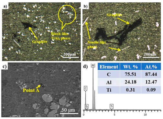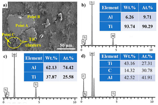 26] demonstrates that the wettability between Al and Ti is greater than that between Al and C; that is to say, the existence of Equation (1) is reasonable. As described in