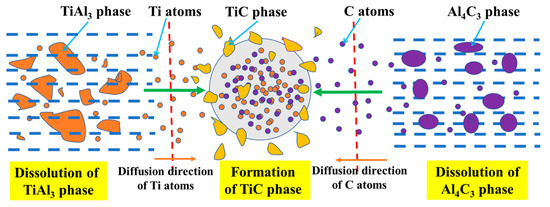 Based on the above discussion on the formation of TiC, a schematic illustration of the formation mechanism of TiC resulting from the reaction of Al