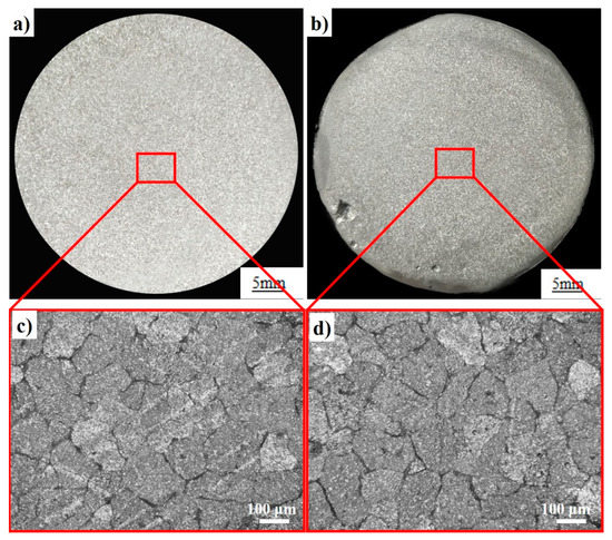 The metallographic observation was carried out using an Olympus optical microscope (OM) (OLYMPUS-GX71-6230A, Olympus (China) Co., Ltd., Suzhou, China), and the average grain size was evaluated using the linear intercept method. The phases were analyzed using X-ray diffraction (XRD) with Cu-Kα radiation (scanning speed of 10°/min, step size of 0.02°, scanning angle from 20° to 90°). The Fei-quanta 200 scanning electron microscope (SEM), (Fei-quanta 200, FEI Company, Hillsboro, OR, USA) equipped with an energy dispersive spectrometer (EDS) (SystemSix, Thermo Fisher Company, Shanghai, China), was employed to observe the microstructures. The average grain size of all refined samples was measured using the linear intercept method.