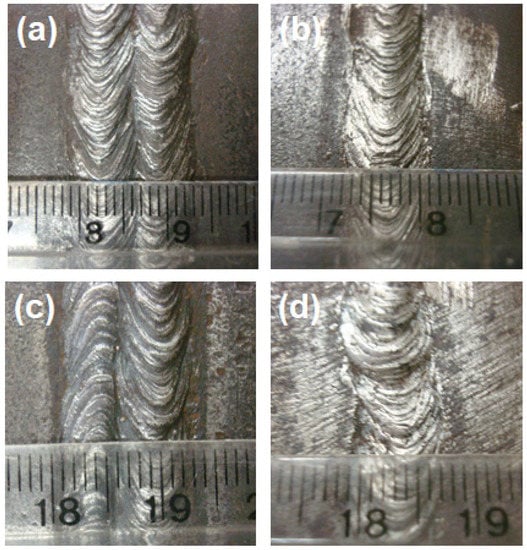 Typical Q&T HHA steel welded joints. With higher heat input: (a) top and (b) root. With lower heat input: (c) top and (d) root. (Ruler small divisions in mm).