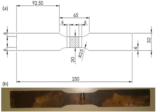 Tensile test specimens: (a) schematic with dimensions (mm), and (b) actually tested specimen with rupture beginning at the HAZ.