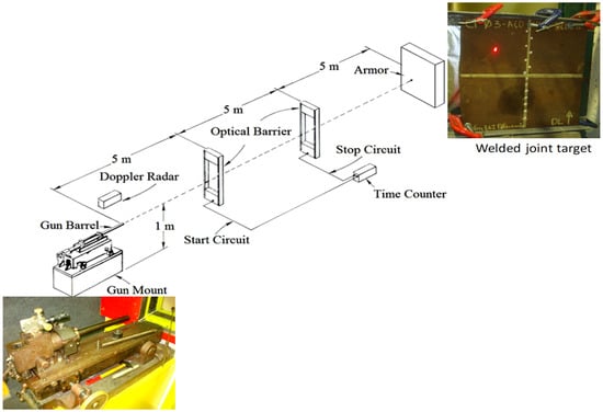 Ballistic tests were performed at the Brazilian Army Assessment Center (CAEx), Rio de Janeiro, according to the US Military standard [26]. A schematic illustration of the ballistic test is shown in Figure 4. Evaluation of ballistic performance was quantitatively done by the ballistic limit velocity V50, which provides a 50% probability of a projectile velocity to pierce a material.