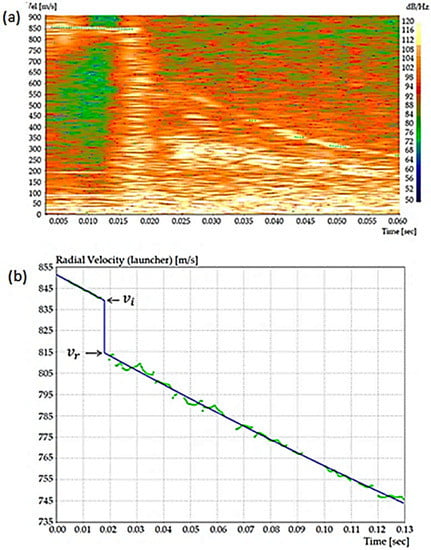 Impact and residual velocities measurement by Doppler radar: (a) actual computer recorded image (radar spectrum) of projectile velocity variation with time and (b) experimental points by FFT curve fitting. Reproduced with permission from [32].
