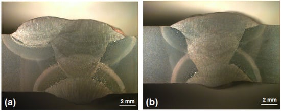 Macroscopic transversal section of welded steel: (a) with higher heat input; (b) with lower heat input.