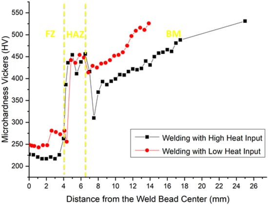 Graphical profile of microhardness measurements along the transversal section of the welded HHA steel for both heat input conditions.