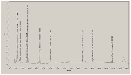 As mentioned before, a comparison of the algorithms of the UV spectra of the peaks of the chromatograms with those of the digital library was made. Each peak was individually reviewed, checking the coincidence of its retention time and UV spectrum with the polyphenols of the spectra recorded in the library. Once the results were obtained, the sum of the total area of the peaks identified in the chromatogram as non-tannins, tannins, and unidentified was performed.