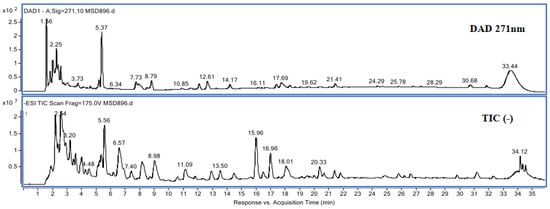 Table 5, in the olive pulp there are 39.6% tannins, that is, 39.6% of polyphenols that may be suitable for tanning. However, with the HPLC-DAD technique, there are still 46.1% of unidentified substances. To improve the identification and see if more tannins can be obtained, an identification of polyphenols was carried out by HPLC-ESI/MS that in addition to identifying more compounds the molecular mass can be determined. Therefore, it will be possible to better define the polyphenols that will have the tan capacity (i.e., polyphenols with a molecular mass between 300 and 5000 Da).
