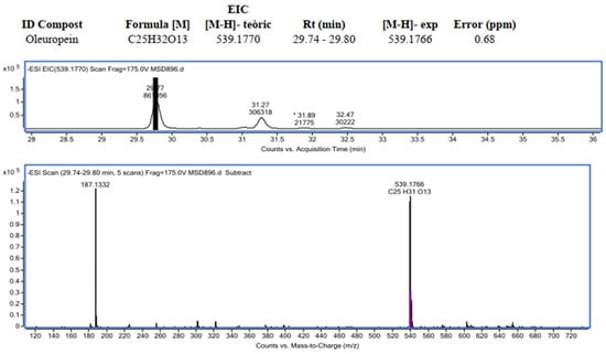 Figure 6, an example of the spectrum (TIC) ESI-TOF (-) corresponding to the compound Oleuropein can be seen, that jointly to hydroxytirosol have important biological properties (anti-inflammatory, anti-atherogenic, anticancer, antimicrobial, and antiviral) as shown in many studies, and that is why it has been gaining prominence in research [