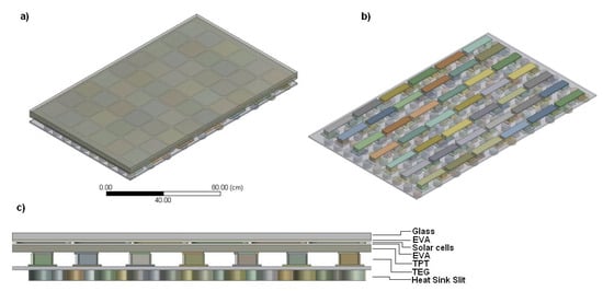 PV–TEG hybrid system model. View of the entire system: (a) TEG cells with a cylindrical heat sink, (b) front view through the PV–TEG system with of all layers description (c).