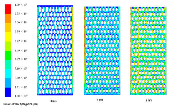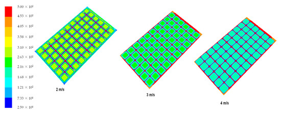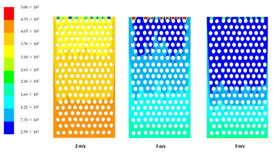 Figure 4 shows temperature distribution for six different air speeds at the heat sink inlet. As illustrated, as the air speed increases, the caused heat transfer coefficient also increases above 4 m/s and cools the heat sink evenly. Moreover, it may be concluded that the air circulation is more effective due to the turbulent air flows. The images obtained from the simulations show velocity contours for three different air velocities. The temperature changes dynamically and dead volume zones can be seen, in which the occurrence of no or very low flow circulation are significantly reduced. The control volume is more intensive and the temperature distribution is more homogeneous. The heat sink reduces the temperature of TEG and maintains the electrical efficiency at higher level. The heat transfer increases with increasing air velocity, and the effectiveness of the friction coefficient decreases. As seen from Figure 3, low air velocity, e.g., 1 m/s, causes high temperature gradients and low heat transfer coefficient. In the case of high wind speeds (6–8 m/s), low temperature gradients occur and the temperature is evened along the entire length of the heat sink. As the wind speed increases, the total temperature gradients disappear, but intensity of a dead volume, where the air gets stuck and is heated up, is significant. The best temperature distribution occurs for high wind speeds.