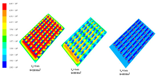 A total of 42 TEG cells were used in the simulation of the PV panel. The number of cells has a significant impact on the panel’s temperature gradient. The electrical efficiency of the solar panel is increased by the power generated for the same amount of light energy radiation. The temperature change in TEG cells depending on wind speed and solar radiation intensity is shown in Figure 6. As it can be seen, a solar radiation intensity of 1200 W/m2 and 0 m/s of wind speed in the heatsink of TEG results in a temperature increase in the system due to the lack of temperature gradient. When a passive radiator is used, the temperature distribution is different. Wind speed and intensity of solar radiation are one of the most important parameters affecting the electrical and thermal efficiency of TEG cells. With the increase in wind speed (2–8 m/s) and solar radiation intensity from 400 to 800 W/m2, the efficiency of TEG cells increases along with the temperature gradient. Low heat utilization at a low wind speed (1–2 m/s) contributes to an energy yield of 5–7%, which will significantly increase the payback period.