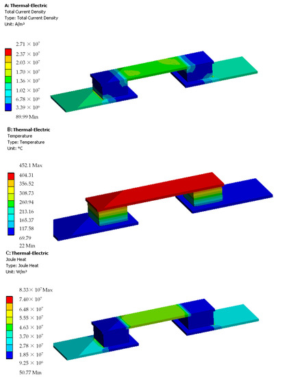 (A) Current density, (B) temperature distribution, and (C) Joule heat on TEG module.