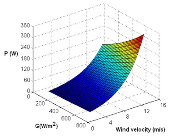 Three-dimensional variation of PV–TEG hybrid system variation of overall power output of the PV–TEG system in a wind velocity function.
